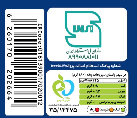 - ترکیبات: ماکارونی، سبزیجات خشک ( پاپریکا، ریحان، گشنیز)، پودر آب پنیر ، مالتودکسترین، پودر سیر، پودر پیاز، زردچوبه، نمک تصفیه شده خوراکی، اسید سیتریک، فلفل سیاه