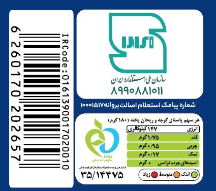 - ترکیبات: ماکارونی، پودر گوجه فرنگی، سبزیجات خشک ( پاپریکا، ریحان)، پودر آب پنیر ، مالتودکسترین، پودر سیر، پودر پیاز، زردچوبه، آویشن، نمک تصفیه خوراکی، طعم دهنده کچاپ، اسید سیتریک، فلفل قرمز